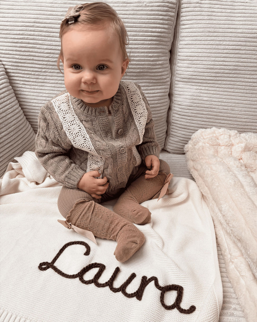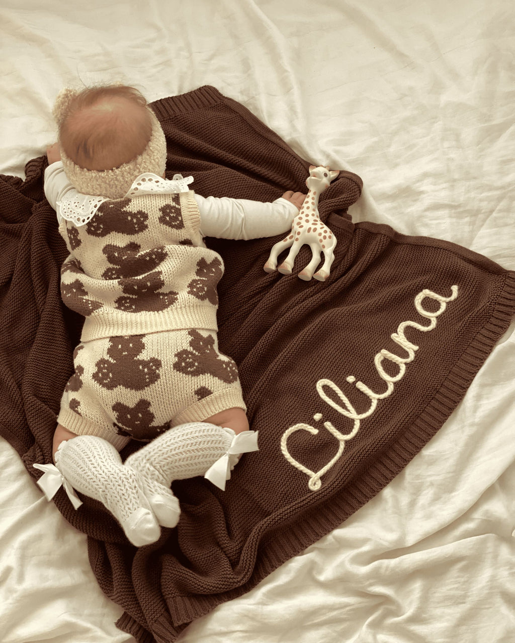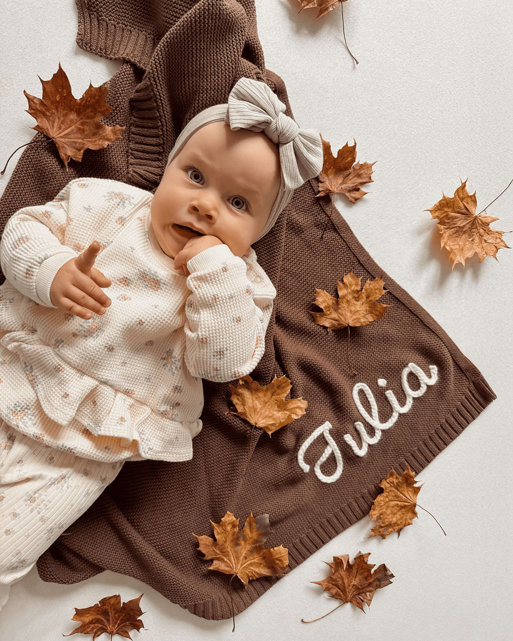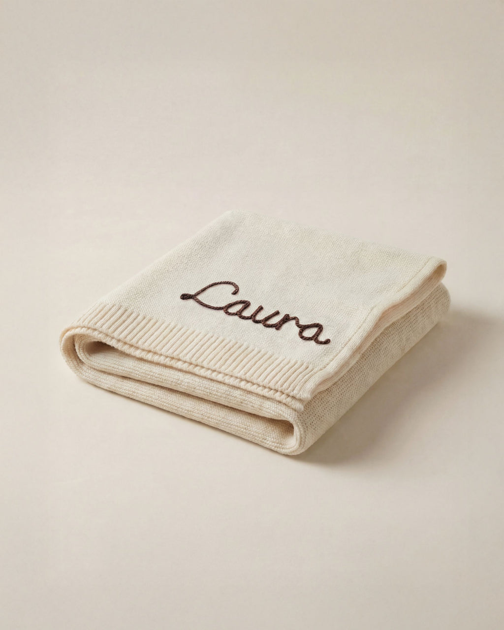 Unsere personalisierten Strickdecken werden Teil dieser kleinen Welt: ein vertrautes Lieblingsstück, das Geborgenheit schenkt und den Alltag begleitet.