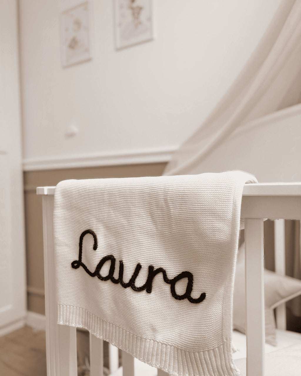 Du kannst den Namen oder ein Wunschwort ganz einfach beim Bestellvorgang angeben. Wir stricken deine Personalisierung mit viel Liebe direkt in die Decke, so entsteht ein ganz persönliches Unikat.